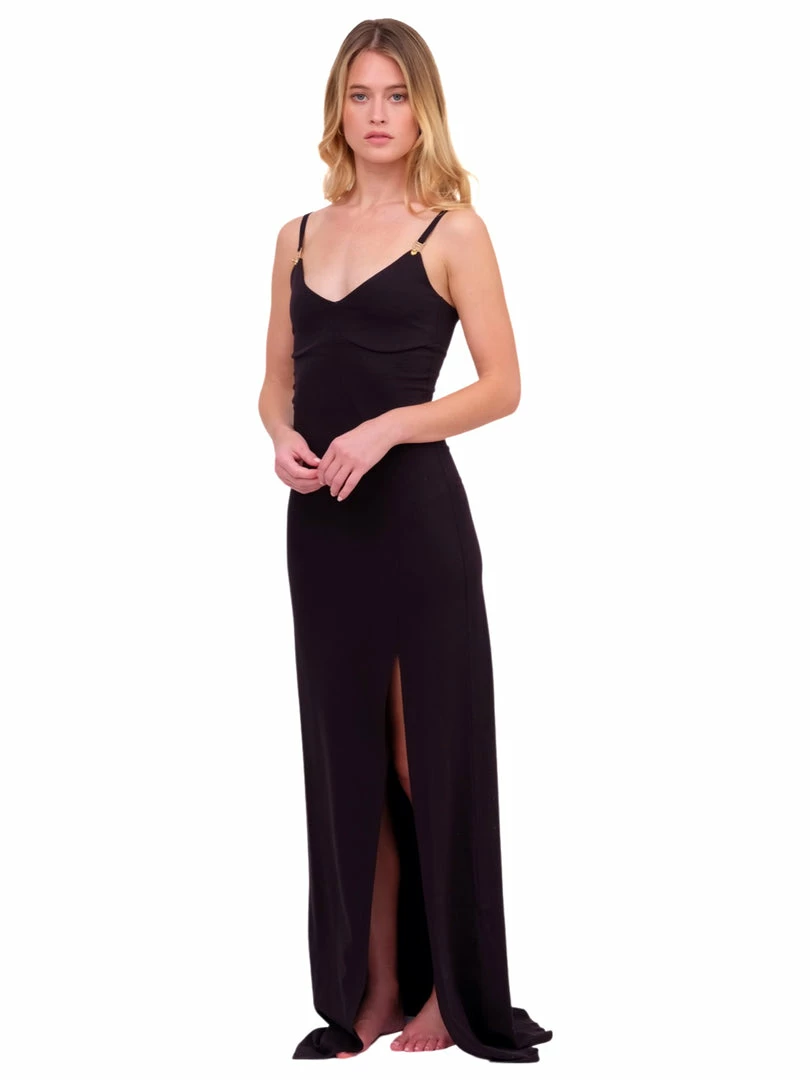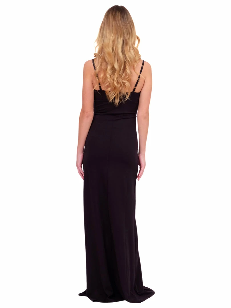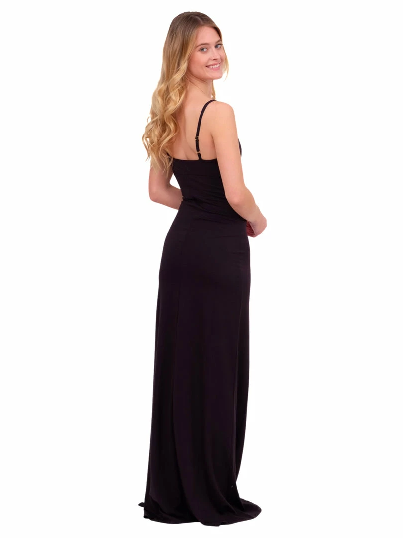 - Pair with heels and a clutch for a sexy night out! The double layered bustline makes it easy to go bra-free, and the deep slit on the left leg is sexy.