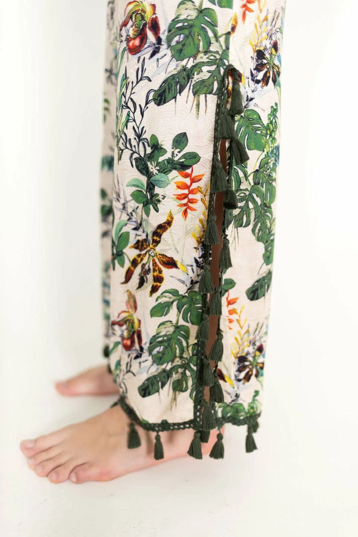 - Side slits on each side of leg with fringe