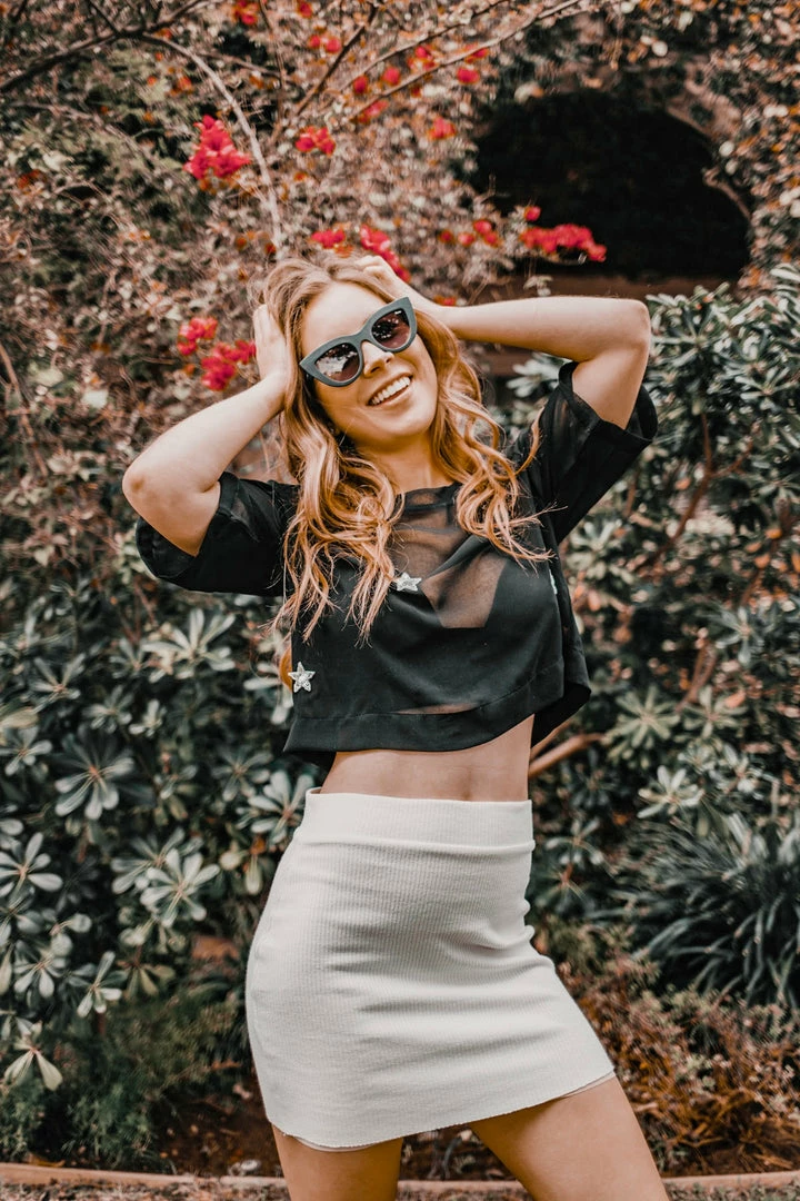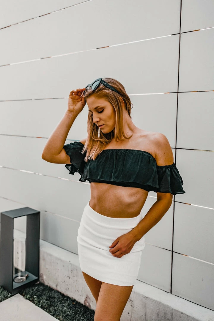 - Model Measurements White Background: Height 5’9″, Bust 32″, Waist 25″, Hips 36″